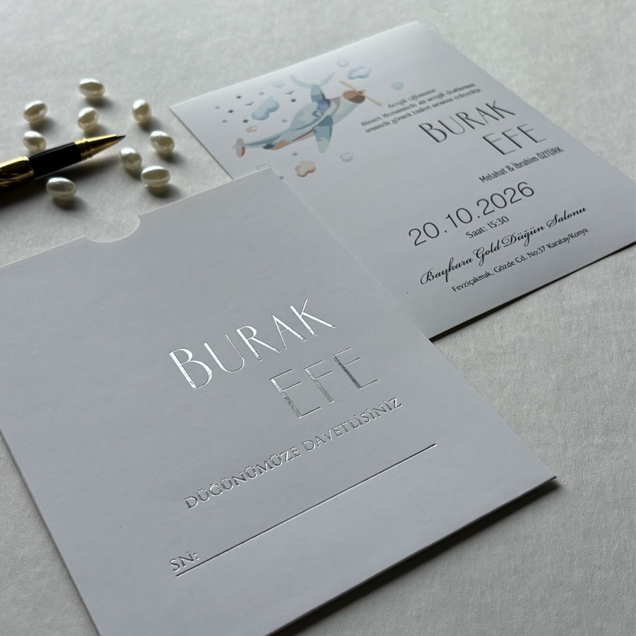 Zarf üzeri altın yaldız baskı, iç kart ofset baskıdır.