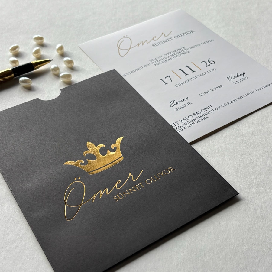 Zarf üzeri altın yaldız baskı, iç kart ofset baskıdır.
