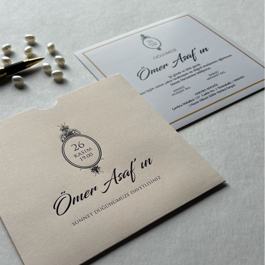 Zarf üzeri altın yaldız baskı, iç kart ofset baskıdır.