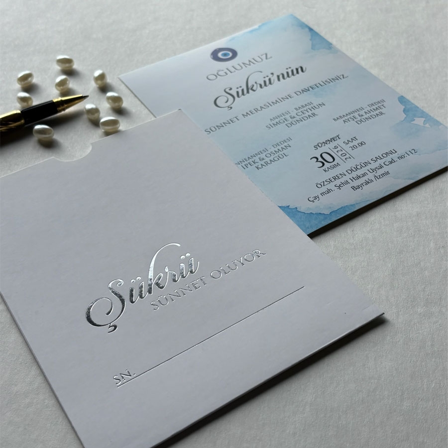 Zarf üzeri altın yaldız baskı, iç kart ofset baskıdır.