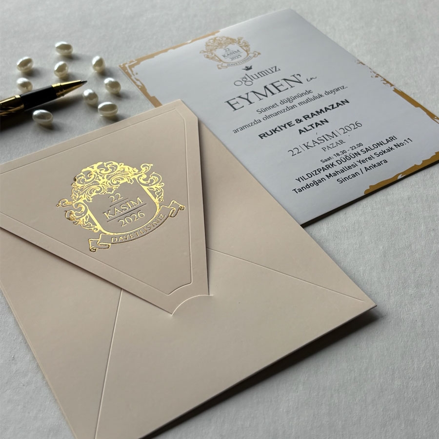 Zarf üzeri altın yaldız baskı, iç kart ofset baskıdır.