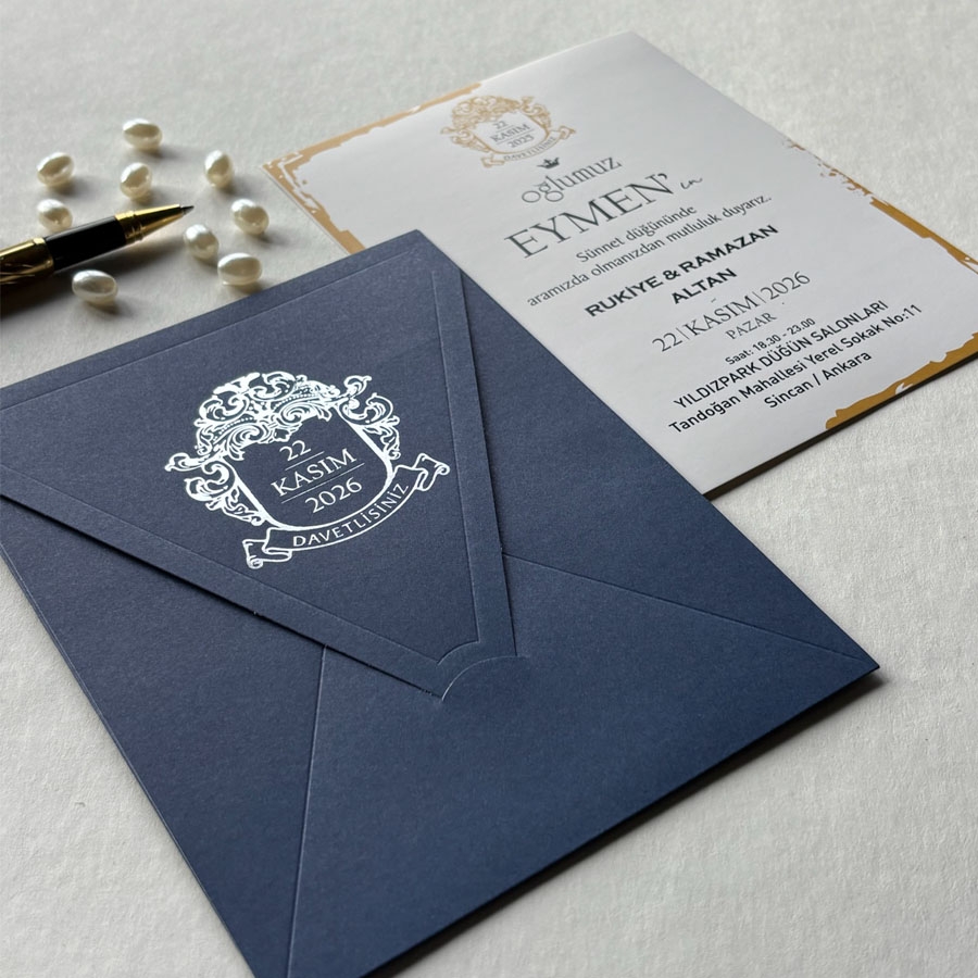 Zarf üzeri altın yaldız baskı, iç kart ofset baskıdır.