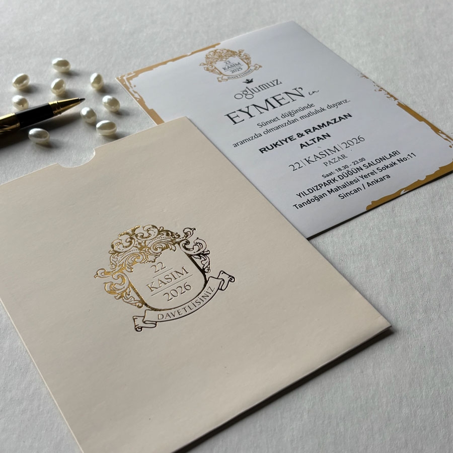 Zarf üzeri altın yaldız baskı, iç kart ofset baskıdır.