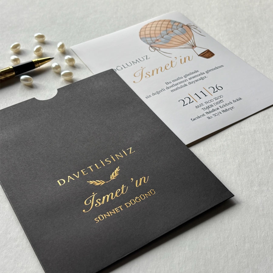 Zarf üzeri altın yaldız baskı, iç kart ofset baskıdır.