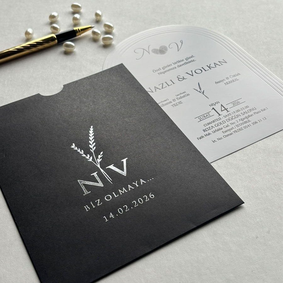 Dikdörtgen Siyah Zarf Oval Kesimli Gofreli Gümüş Yaldızlı Davetiye 105