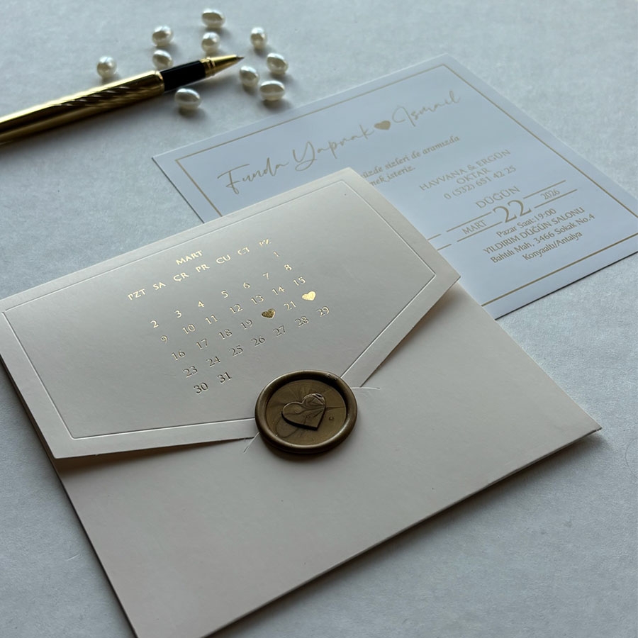 Kapaklı Krem Zarf Altın Yaldızlı Mühürlü Davetiye -106