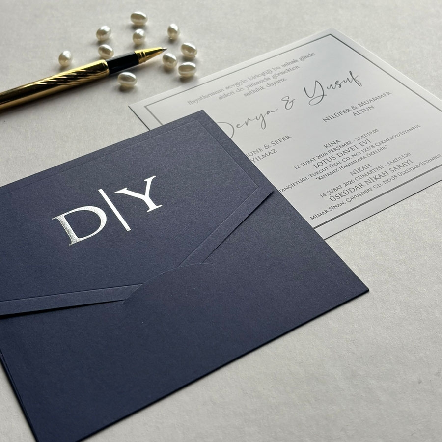 Kare Kapaklı Lacivert Zarf Gümüş Yaldızlı Davetiye 10