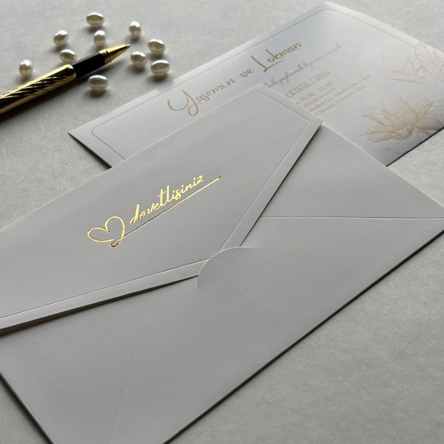 Yatay Dikdörtgen Beyaz Zarf Gold Yaldızlı Davetiye - 1050