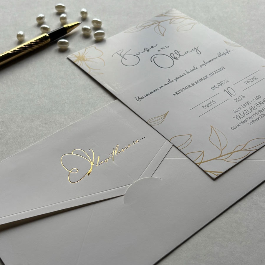 Yatay Dikdörtgen Beyaz Zarf Gold Yaldızlı Davetiye - 945