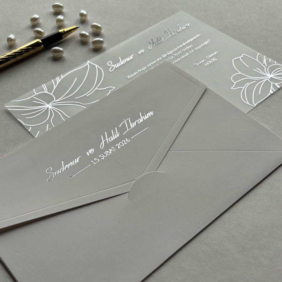 Zarf 220 gram renklendirilmiş bristol, iç kart ise 30 Mikron Şeffaf karta baskı yapılmaktadır.