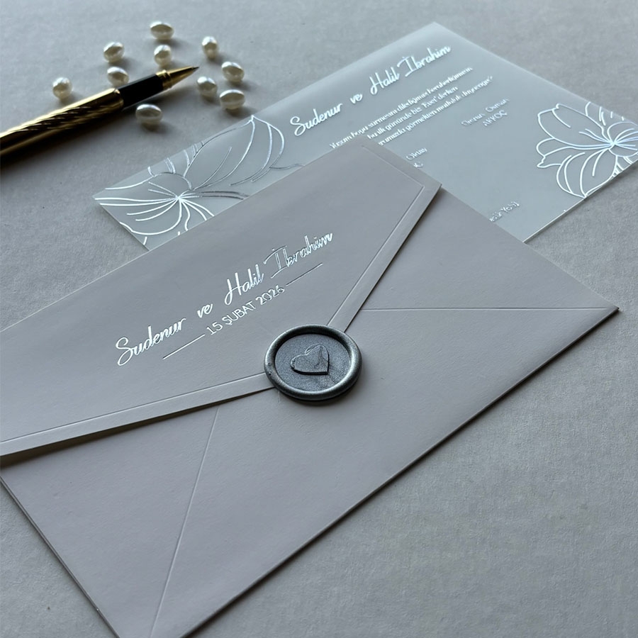 Yatay Dikdörtgen Beyaz Zarf İç Kart Şeffaf Gümüş Yaldız Baskılı Mühürlü Davetiye - 130