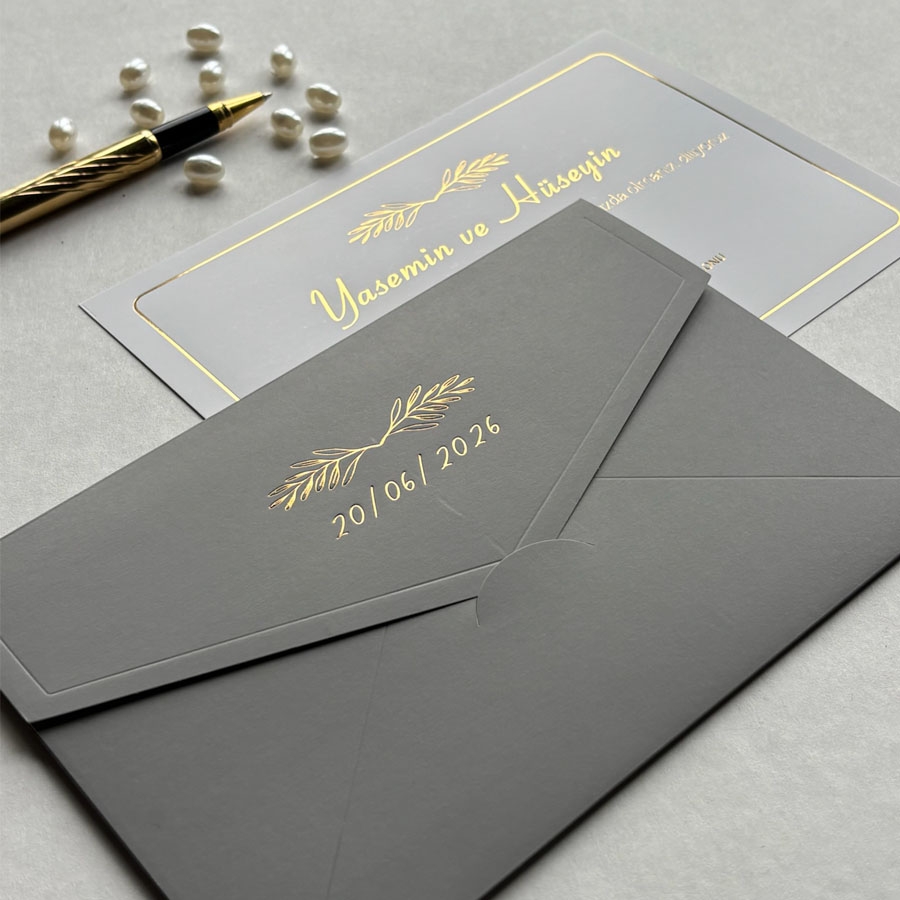 Yatay Dikdörtgen Gri Zarf Gold İç Kart Yaldızlı Davetiye - 380