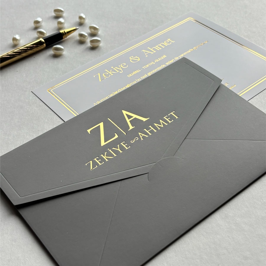Yatay Dikdörtgen Gri Zarf Gold İç Kart Yaldızlı Davetiye - 601