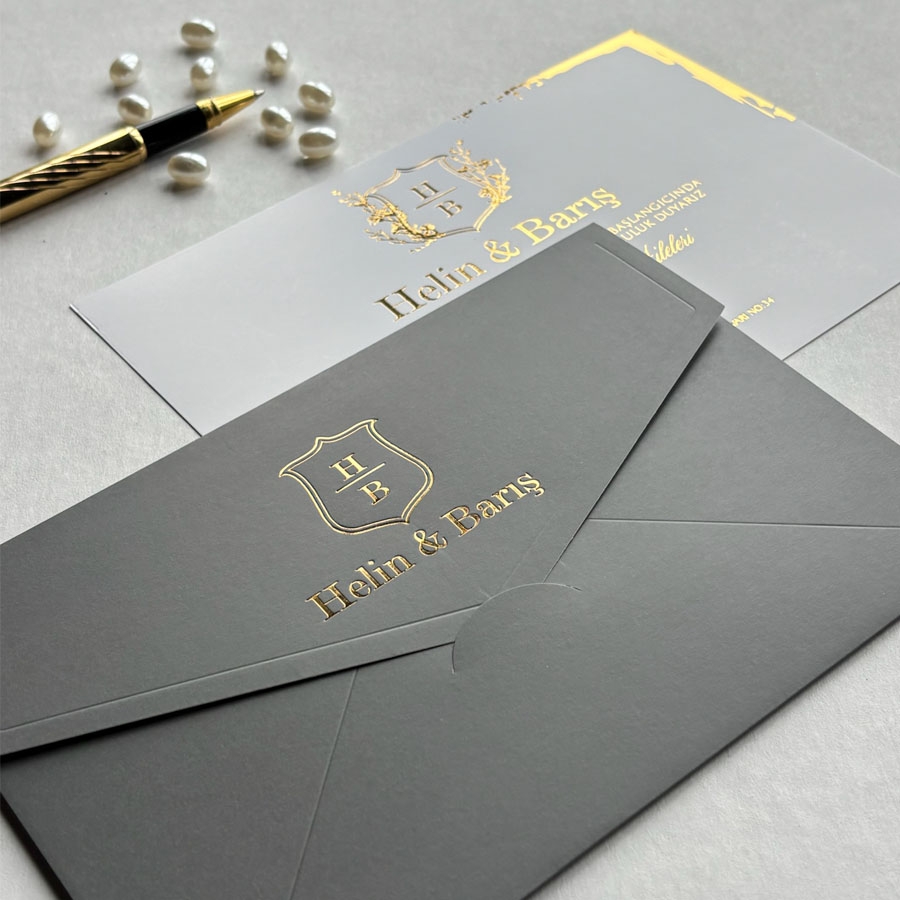Yatay Dikdörtgen Gri Zarf Gold İç Kart Yaldızlı Davetiye - 751