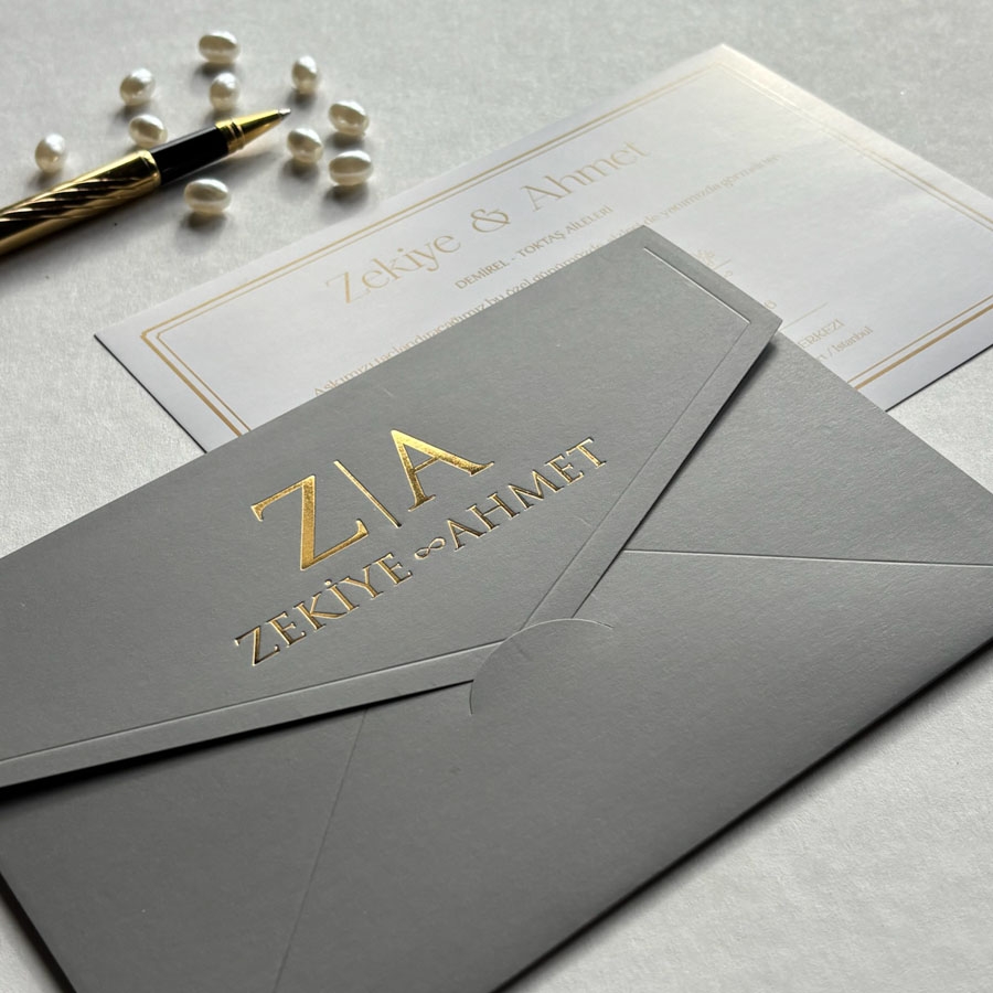 Yatay Dikdörtgen Gri Zarf Gold Yaldızlı Davetiye - 365