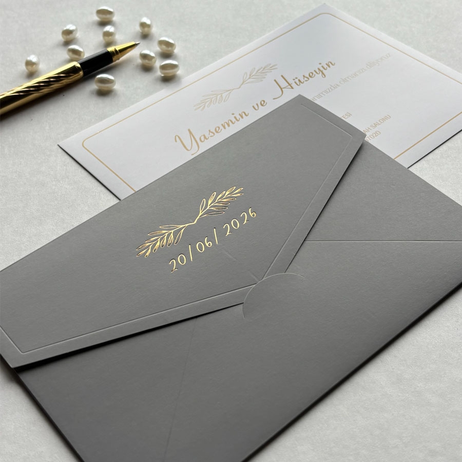 Yatay Dikdörtgen Gri Zarf Gold Yaldızlı Davetiye - 495