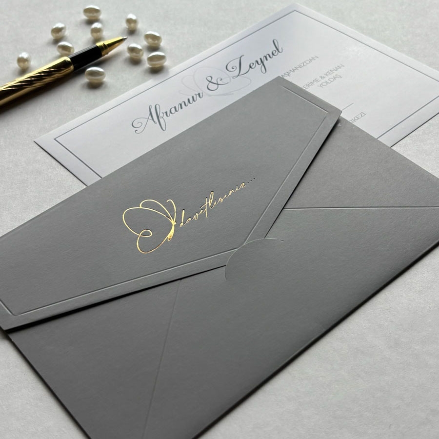Yatay Dikdörtgen Gri Zarf Gold Yaldızlı Davetiye - 676