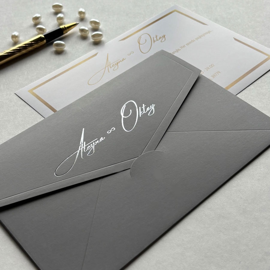 Yatay Dikdörtgen Gri Zarf Gümüş Yaldızlı Davetiye - 585