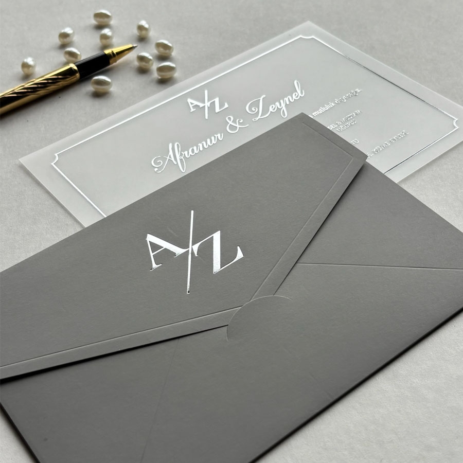 Yatay Dikdörtgen Gri Zarf Gümüş Yaldızlı Şeffaf Davetiye - 955
