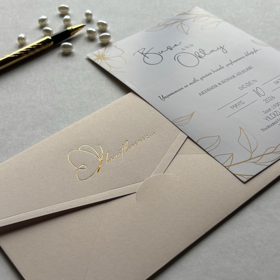 Yatay Dikdörtgen Krem Zarf Gold Yaldızlı Davetiye - 940