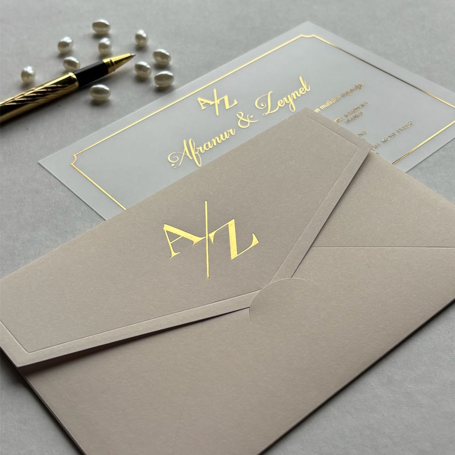 Yatay Dikdörtgen Krem Zarf Gold Yaldızlı Şeffaf Davetiye - 900