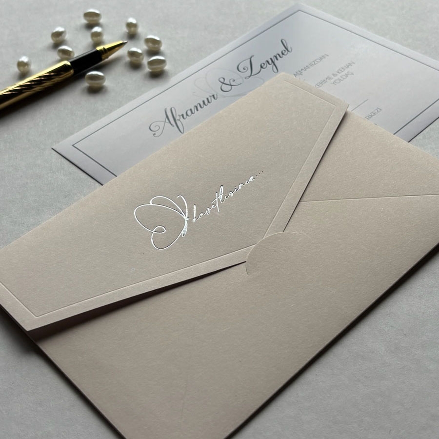 Zarf 220 gram renklendirilmiş bristol, iç kart ise 250 gram Amerikan Bristol karta baskı yapılmaktadır.