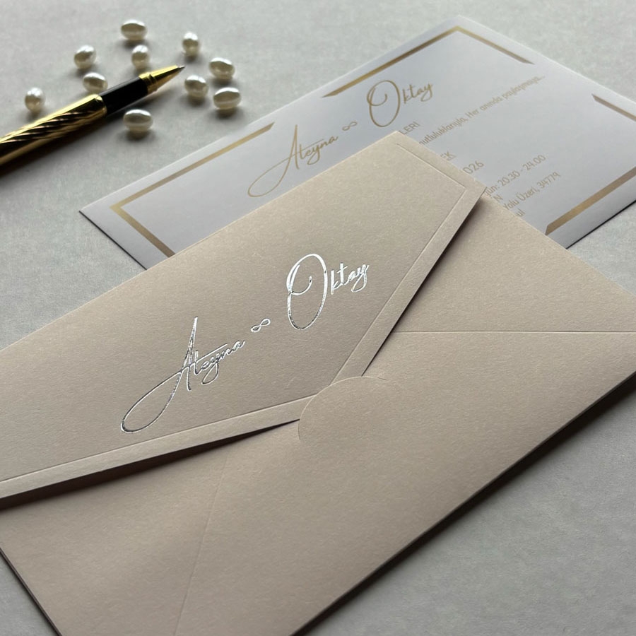 Zarf 220 gram renklendirilmiş bristol, iç kart ise 250 gram Amerikan Bristol karta baskı yapılmaktadır.