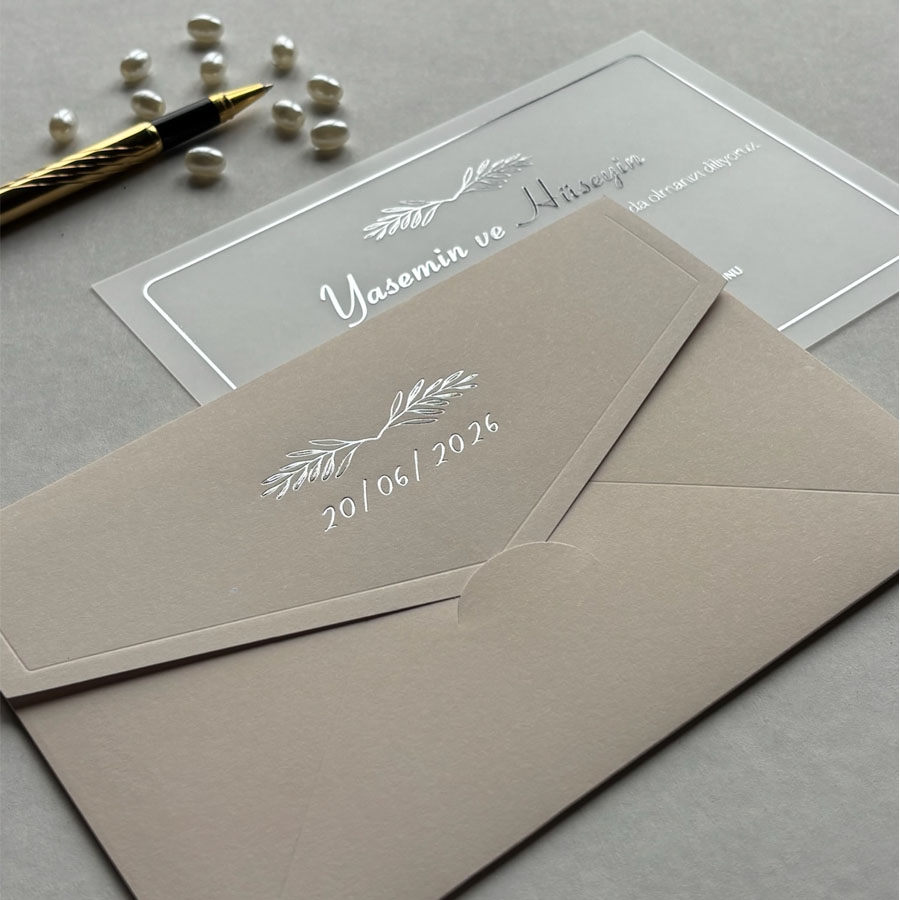 Yatay Dikdörtgen Krem Zarf Gümüş Yaldızlı Şeffaf Davetiye - 675