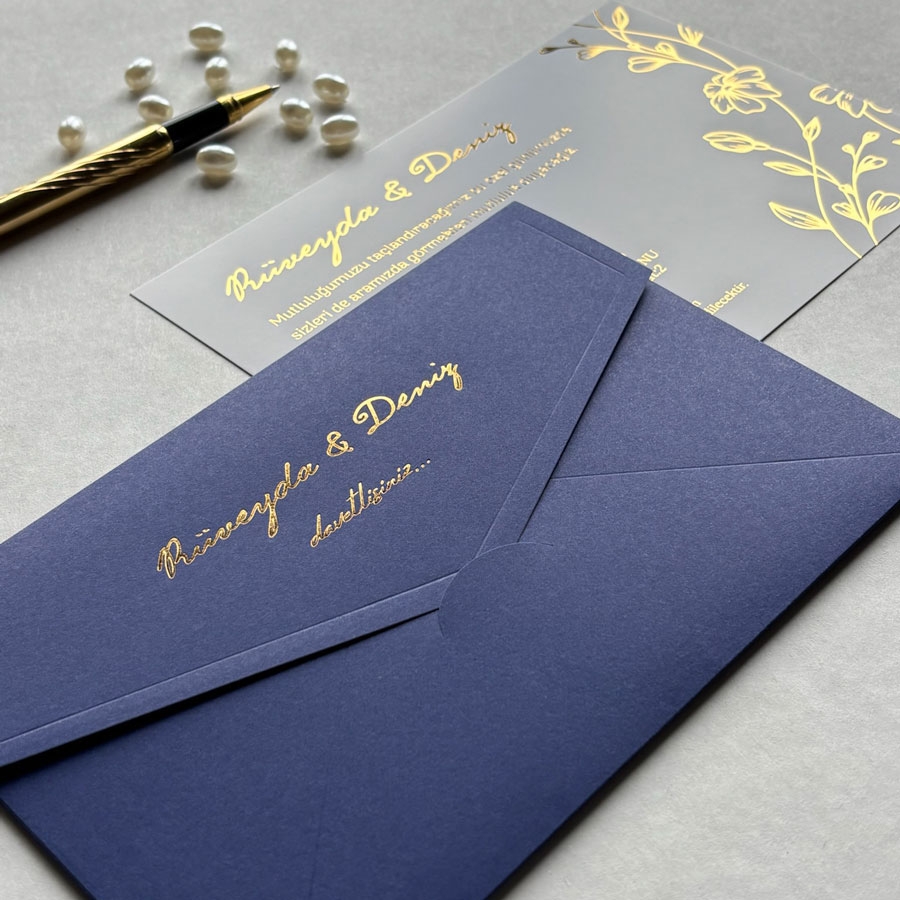 Yatay Dikdörtgen Lacivert Zarf Gold İç Kart Yaldızlı Davetiye - 10