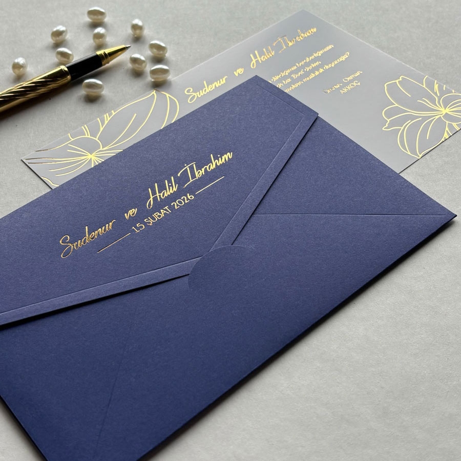 Yatay Dikdörtgen Lacivert Zarf Gold İç Kart Yaldızlı Davetiye - 875