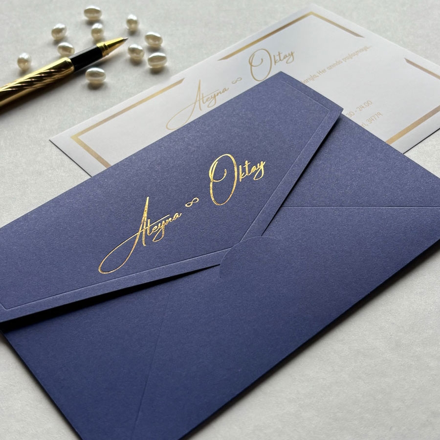 Yatay Dikdörtgen Lacivert Zarf Gold Yaldızlı Davetiye - 570