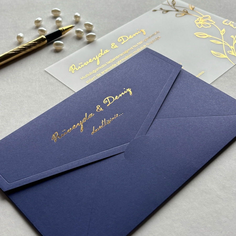 Yatay Dikdörtgen Lacivert Zarf Gold Yaldızlı Şeffaf Davetiye - 701