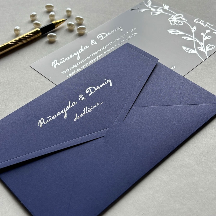 Yatay Dikdörtgen Lacivert Zarf Gümüş İç Kart Yaldızlı Davetiye - 731