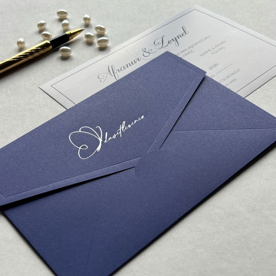 Yatay Dikdörtgen Lacivert Zarf Gümüş Yaldızlı Davetiye - 1025