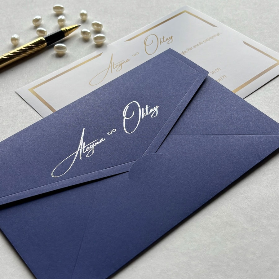 Yatay Dikdörtgen Lacivert Zarf Gümüş Yaldızlı Davetiye - 600