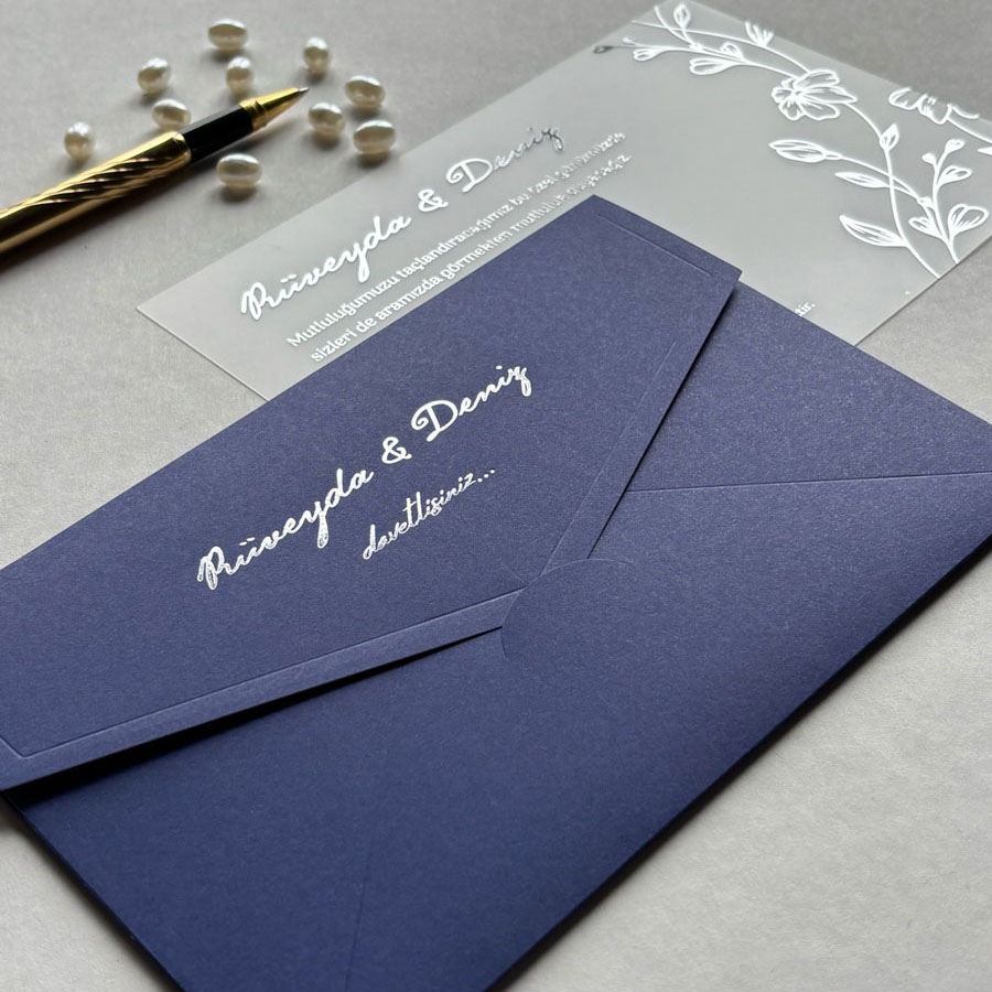Yatay Dikdörtgen Lacivert Zarf Gümüş Yaldızlı Şeffaf Davetiye - 320