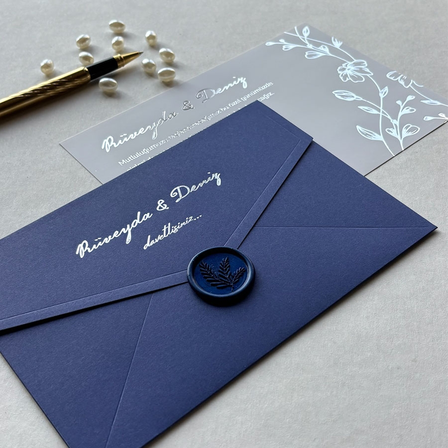 Yatay Dikdörtgen Lacivert Zarf İç Kart Gümüş Yaldız Baskılı Mühürlü Davetiye - 118
