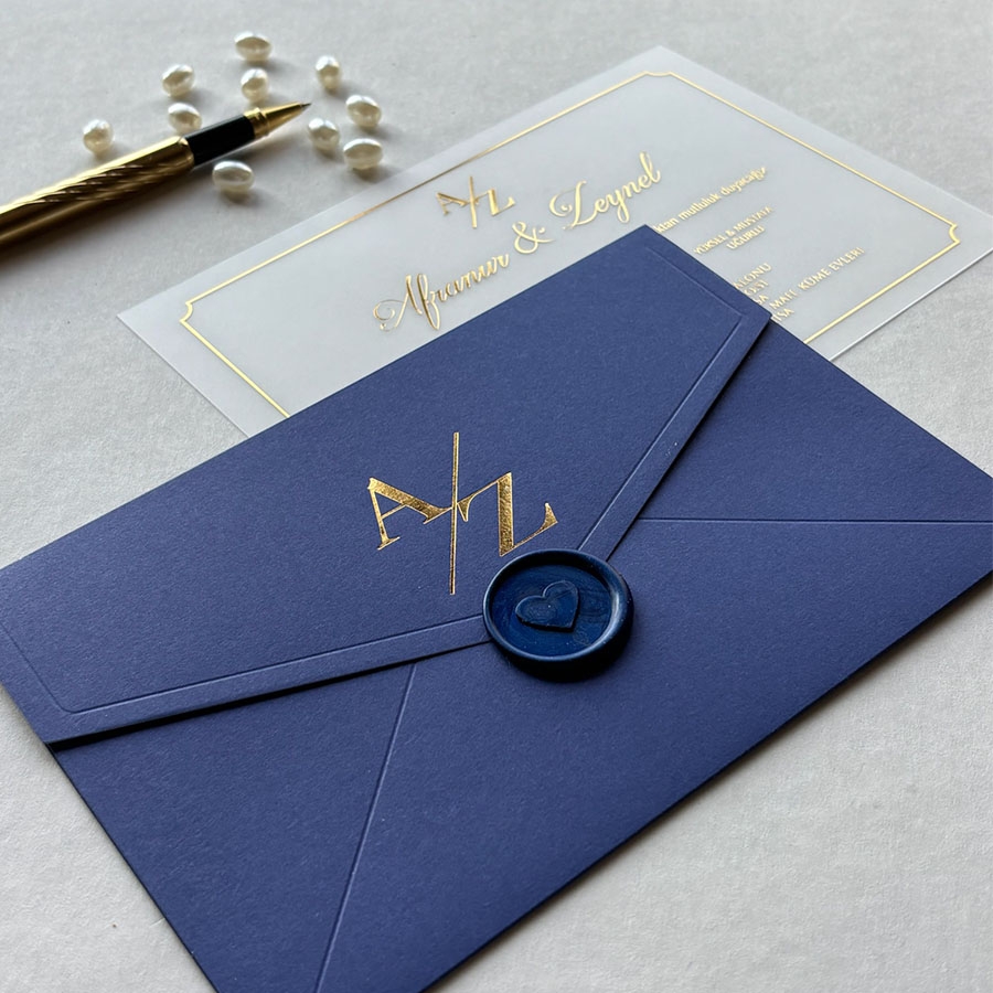 Yatay Dikdörtgen Lacivert Zarf İç Kart Şeffaf Gold Yaldız Baskılı Mühürlü Davetiye - 129