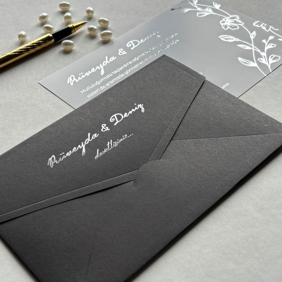 Yatay Dikdörtgen Siyah Zarf Gümüş İç Kart Yaldızlı Davetiye - 751