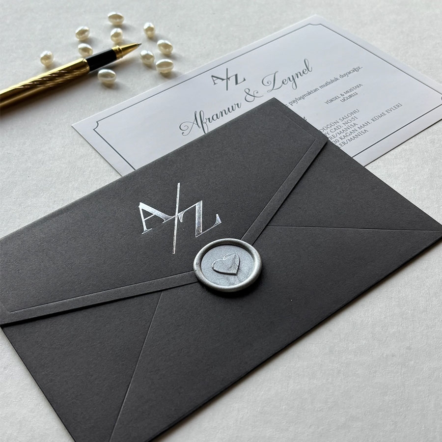 Yatay Dikdörtgen Siyah Zarf Gümüş Yaldız Baskılı Mühürlü Davetiye - 107