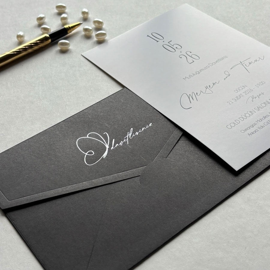 Zarf 220 gram renklendirilmiş bristol, iç kart ise 250 gram Amerikan Bristol karta baskı yapılmaktadır.