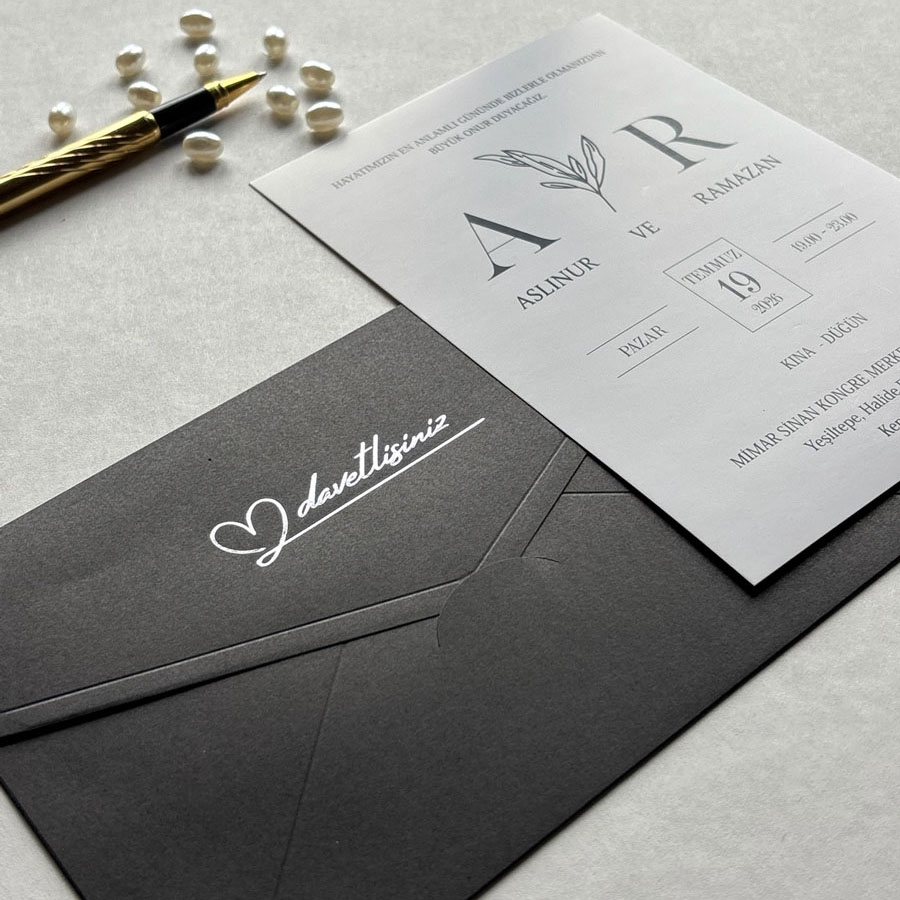 Zarf 220 gram renklendirilmiş bristol, iç kart ise 250 gram Amerikan Bristol karta baskı yapılmaktadır.