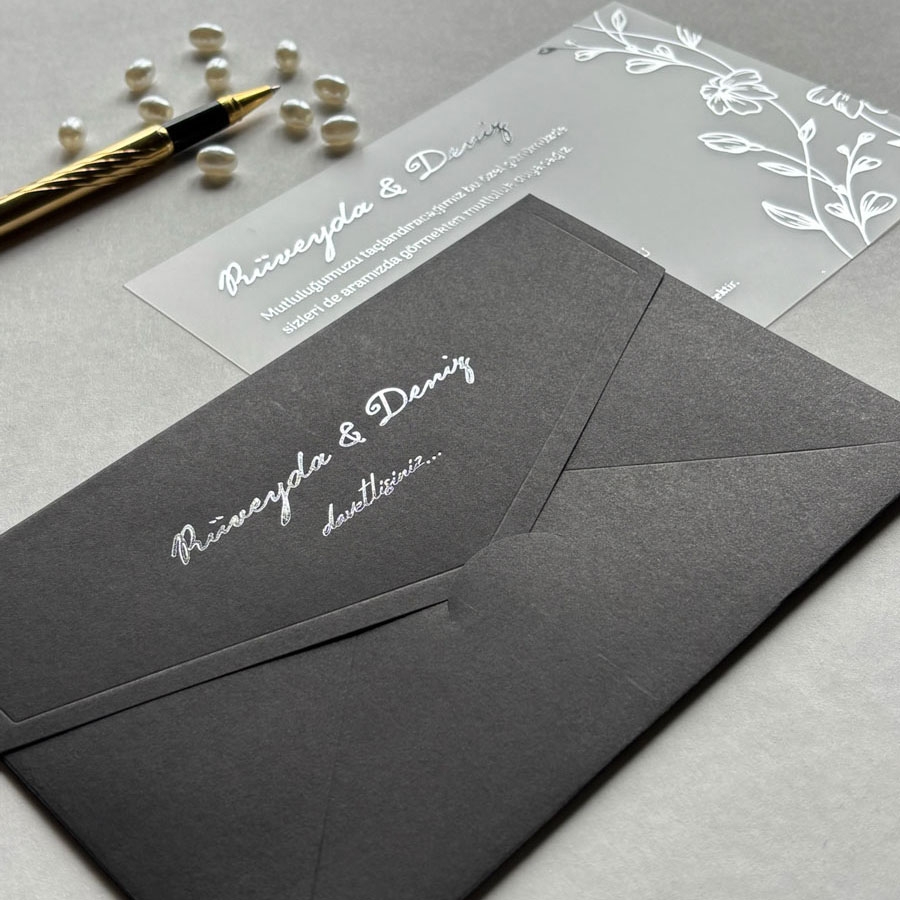 Yatay Dikdörtgen Siyah Zarf Gümüş Yaldızlı Şeffaf Davetiye - 325