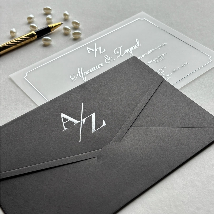 Yatay Dikdörtgen Siyah Zarf Gümüş Yaldızlı Şeffaf Davetiye - 625