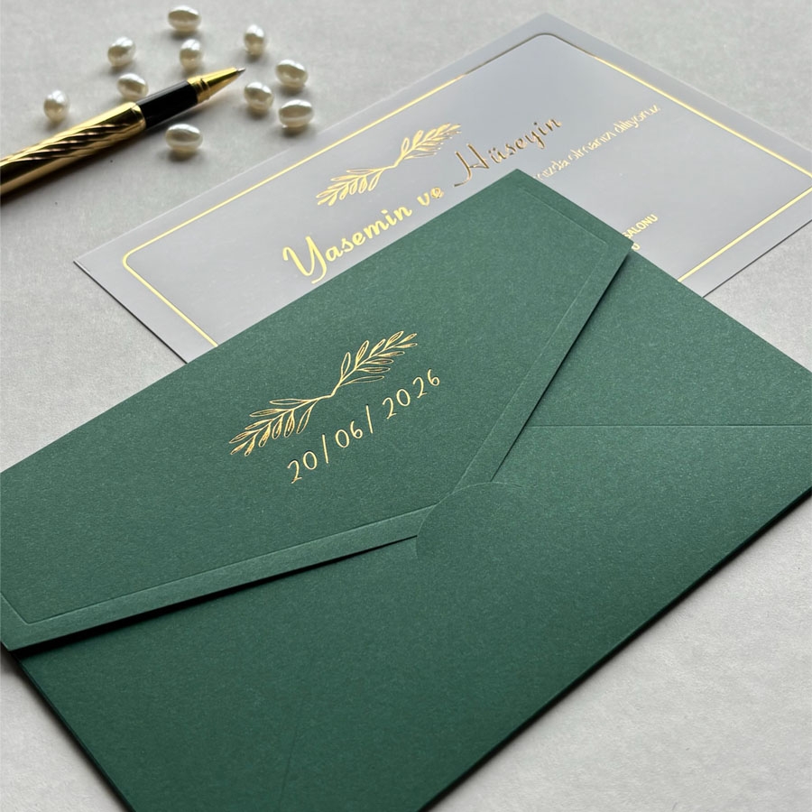 Yatay Dikdörtgen Yeşil Zarf Gold İç Kart Yaldızlı Davetiye - 395