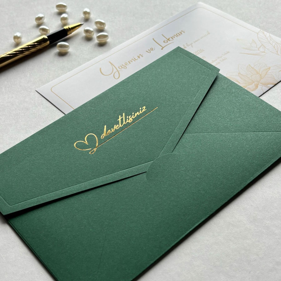 Yatay Dikdörtgen Yeşil Zarf Gold Yaldızlı Davetiye - 1065
