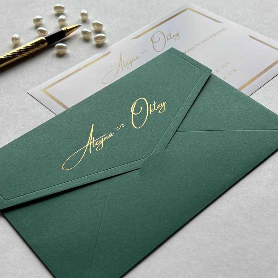 Yatay Dikdörtgen Yeşil Zarf Gold Yaldızlı Davetiye - 575