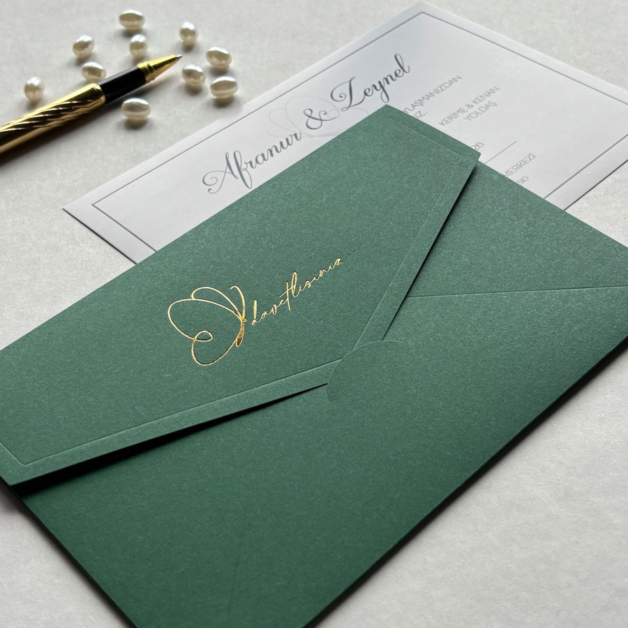 Yatay Dikdörtgen Yeşil Zarf Gold Yaldızlı Davetiye - 636