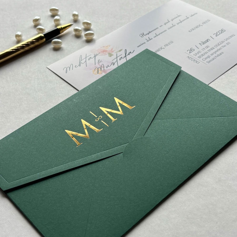 Yatay Dikdörtgen Yeşil Zarf Gold Yaldızlı Davetiye - 656