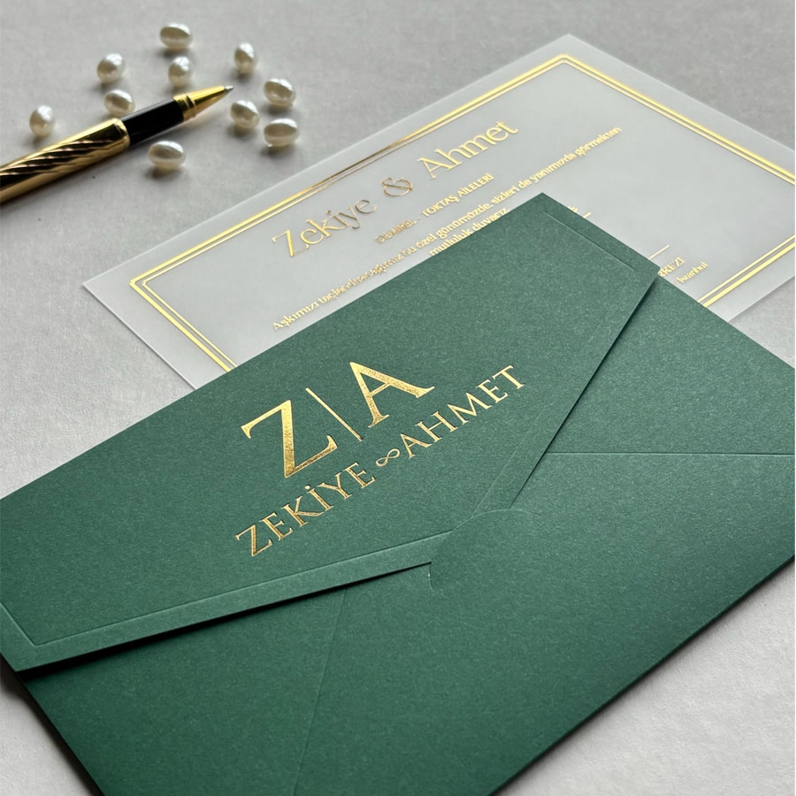 Yatay Dikdörtgen Yeşil Zarf Gold Yaldızlı Şeffaf Davetiye - 381